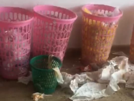 පිරිසිදු නොකල වැසිකිළි වගේම ඒවායේ බිම කලුපාටට මොනවදෝ විසිරිලා තිබුණේ අප්රසන්න අයුරින්