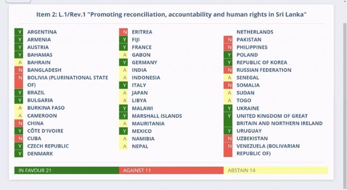 ජිනීවා මානව හිමිකම් මණ්ඩලයේ 46 වන සැසිවාරයට ඉදිරිපත් කර ඇති ශ්රී ලංකාව පිලිබඳව යෝජනාව සම්බන්ධයෙන් වන ජන්ද විමසීම මිට සුළු මොහොතකට පෙර වැඩි ජන්ද 11 කින් සම්මත වුවා.