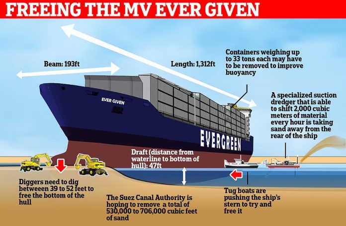 අඩි 1,300ක් දිගැති මේ බහාලුම් නෞඛාව යළි යාත්රා කරවීමට හා සූළුස් ඇළ ඔස්සේ දිවෙන නාවුක වෙළෙඳ මාර්ගය යළි විවෘත කිරීමට ඊයේ (27) උත්සාහ ගෙන තිබිණි. මෙම නැව හිරවීම හේතුවෙන් සූවස් ඇළ ඔස්සේ යාත්රා කරමින් තිබූ නැව් 321ක් මේ වවිට හිරවී තිබේ.