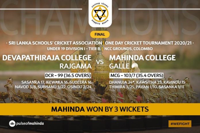 ලකුණු 100ක ඉලක්කය හඹාගිය මහින්ද විද්යාලයීය කණ්ඩායම පන්දුවාර 35.4ක දී කඩුළු 07ක් දැවී එම ඉලක්කය පසු කළහ.
