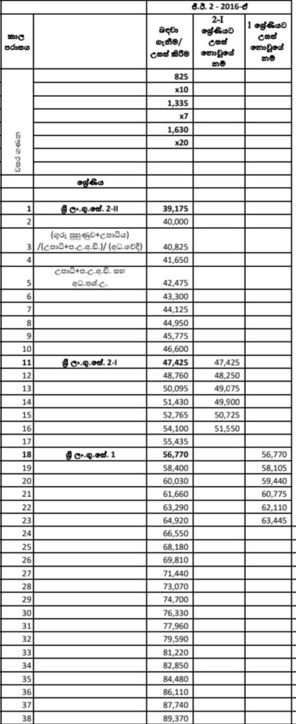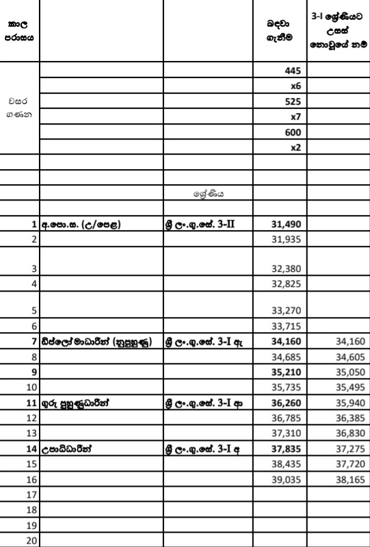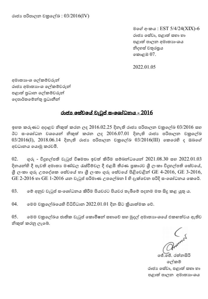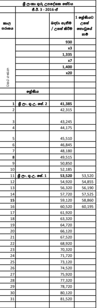 ගුරු විශ්රාම වැටුප් විෂමතා ඉවත් ිකරීම සම්බන්ධයෙන් අමාත්ය මණඩල රැස්වීමේ දී එළැඹි තීරණය අනුව ශ්රී ලංකා විදුහල්පති සේවයේ, ශ්රී ලංකා ගුරු උපදේශක සේවයේ හා ශ්රී ලංකා ගුරු සේවයේ පිළිවෙළින් GE 4-2016, GE 3-2016, GE 2-2016 සහ GE 1-2016 යන වැටුප් පරිමා සංශෝධනය කරන බවයි.