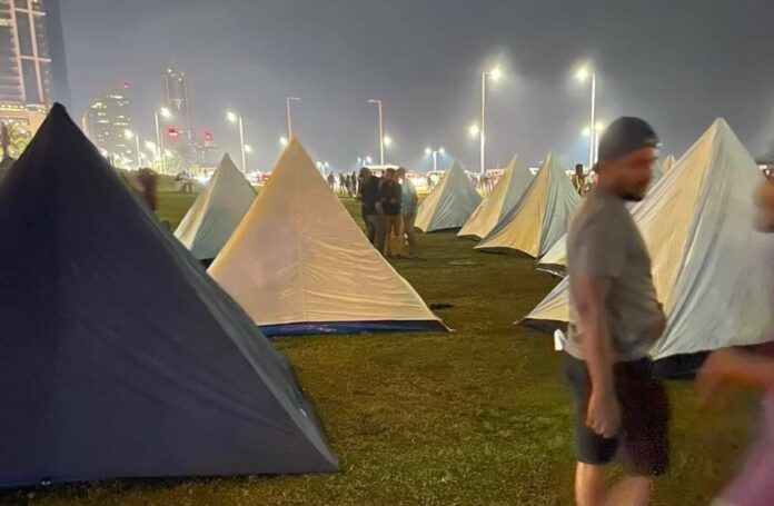 උද්ඝෝෂණයේ යෙදෙන ජනතාවගේ වැස්සෙන් ආරක්ෂාවීමටත් අවශ්ය අවස්ථාවල දී විවේක ගැනීමටත් ගාලු මුවදොර පිටිය පුරා කූඩාරම් පවා ඉදිකර ඇත.