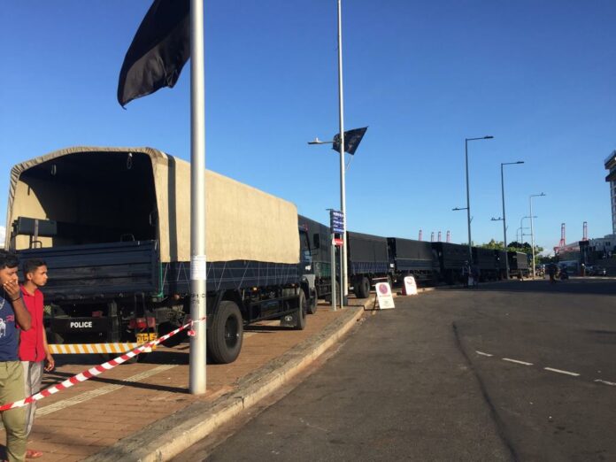 මාර්ගය දිගට පොලිස් ලොරි රථ රැසක් නවතා ඇත.