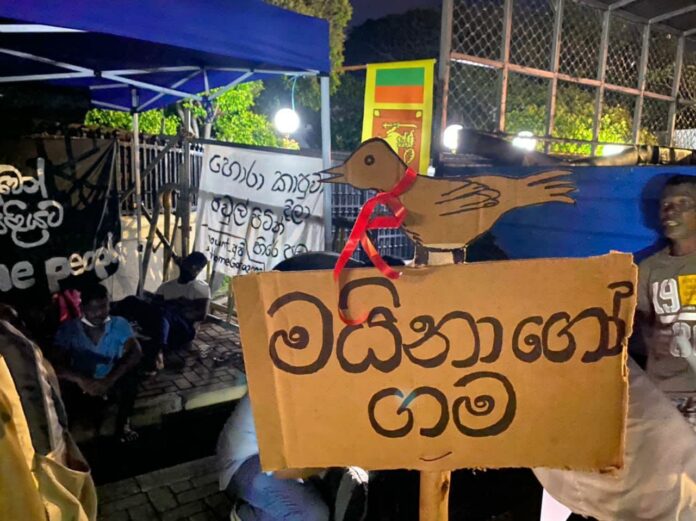 අගමැති නිල නිවස වූ අරලියගහ මන්දිරය ඉදිරිපිට “මයිනාගෝ ගම” විරෝධතාකරුවෝ අද (08) රාත්රිය එළැඹීමත් සමඟ රතිඤ්ඤා දල්වමින් අගමැතිවරයාගේ ඉල්ලා අස්වීමට සිය සතුට ප්රකාශ කරති.