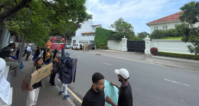 කොළඹ ජාතික කෞතුකාගාරය ඉදිරිපිට පිහිටි ධම්මික පෙරේරාගේ නිවස අසළ අද (12) පිරිසක් උද්ඝෝෂණයක් ආරම්බ කළහ.