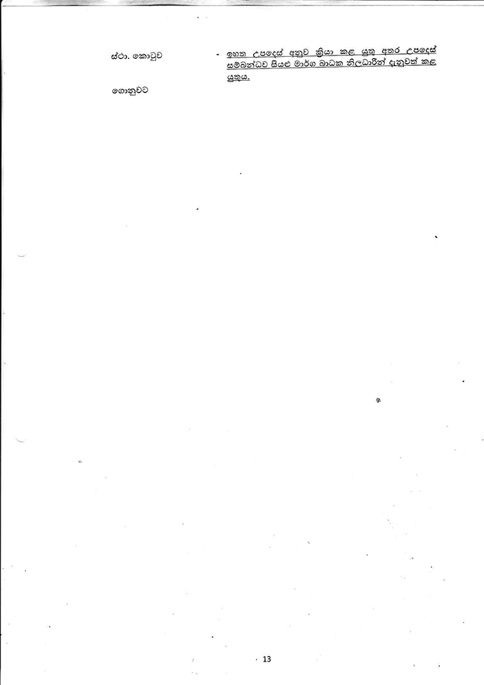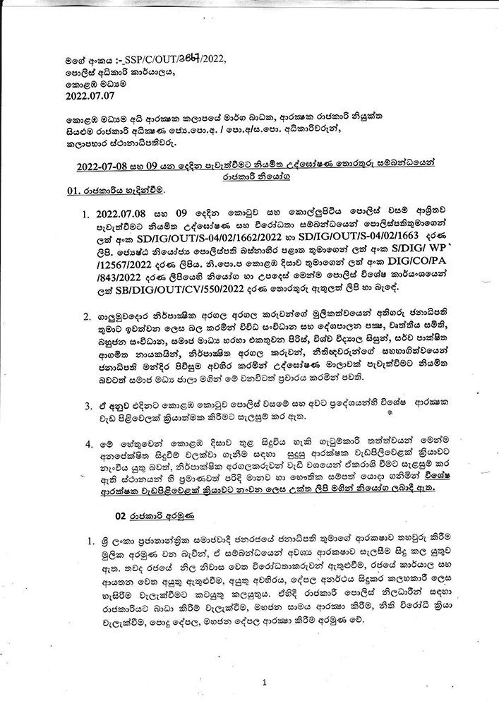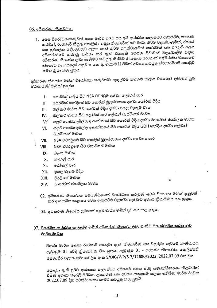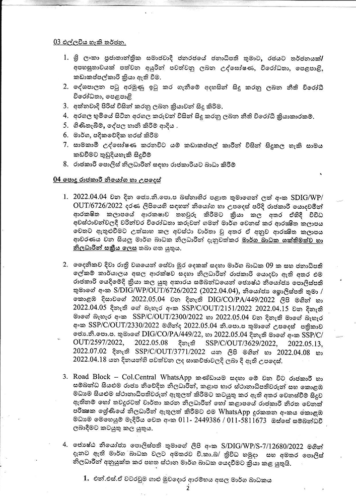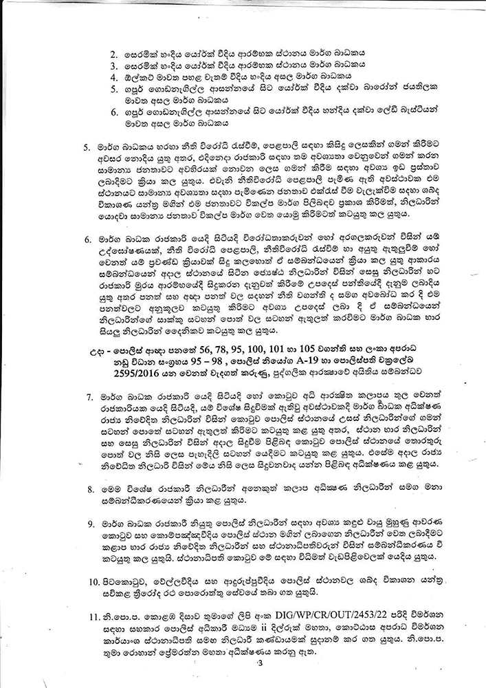 මෙම මාර්ග බාධක හරහා කිසිදු ආකාරයකින් විරෝධ රැස්වීම්, පෙපළපාලි සඳහා ගමන් කිරීටම අවසර නොදිය යුතුයැයි ද සඳහන් කර ඇත.