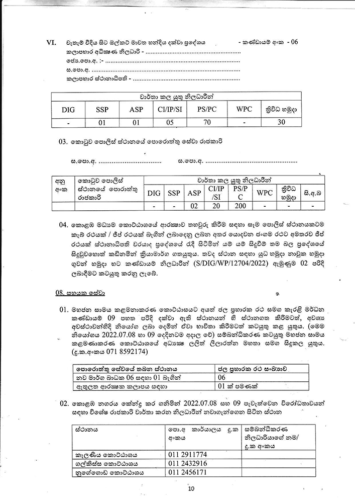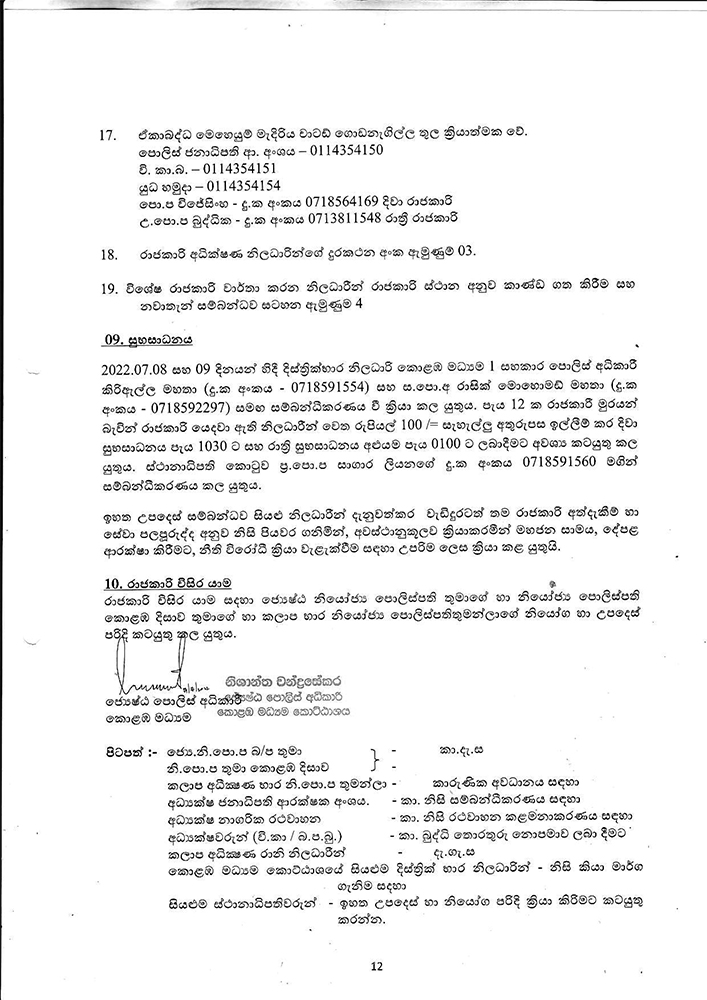 මෙම විශේෂ රාජකාරී සඳහා පැමිණෙන සියලුම නිලධාරීන් අද (08) කොළඹ දිසා නියෝජ්ය පොලිස්පති කාර්යාලයේ සිව්වැනි මහලේ සම්මන්ත්රණ ශාලාවේ දී බස්නාහිර පළාත් භාර ජ්යෙෂ්ඨ නියෝජ්ය පොලිස්පති දේශබන්දු තෙන්නකෝන් විසින් පවත්වන ලද විශේෂ උපදෙස් ලබාදීමේ රැස්වීමකට ද සහභාගී වීමට නියමිතව තිබිණි.