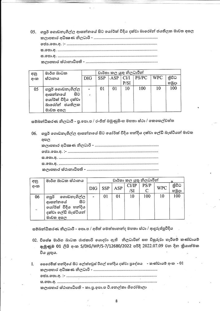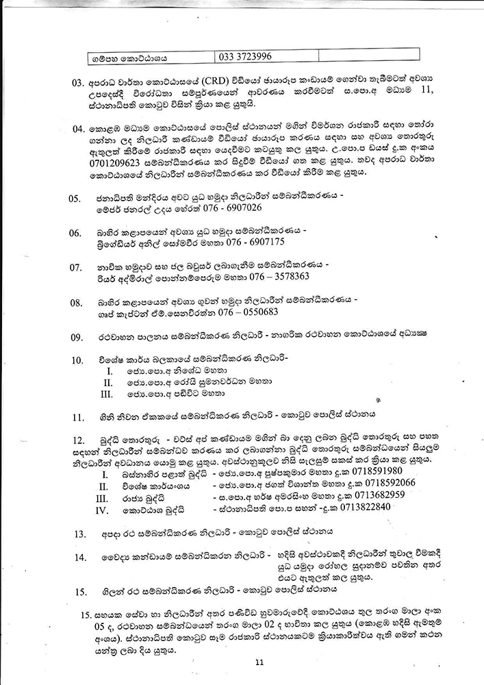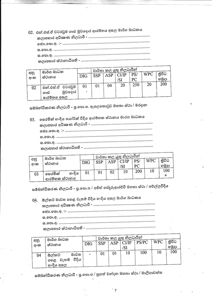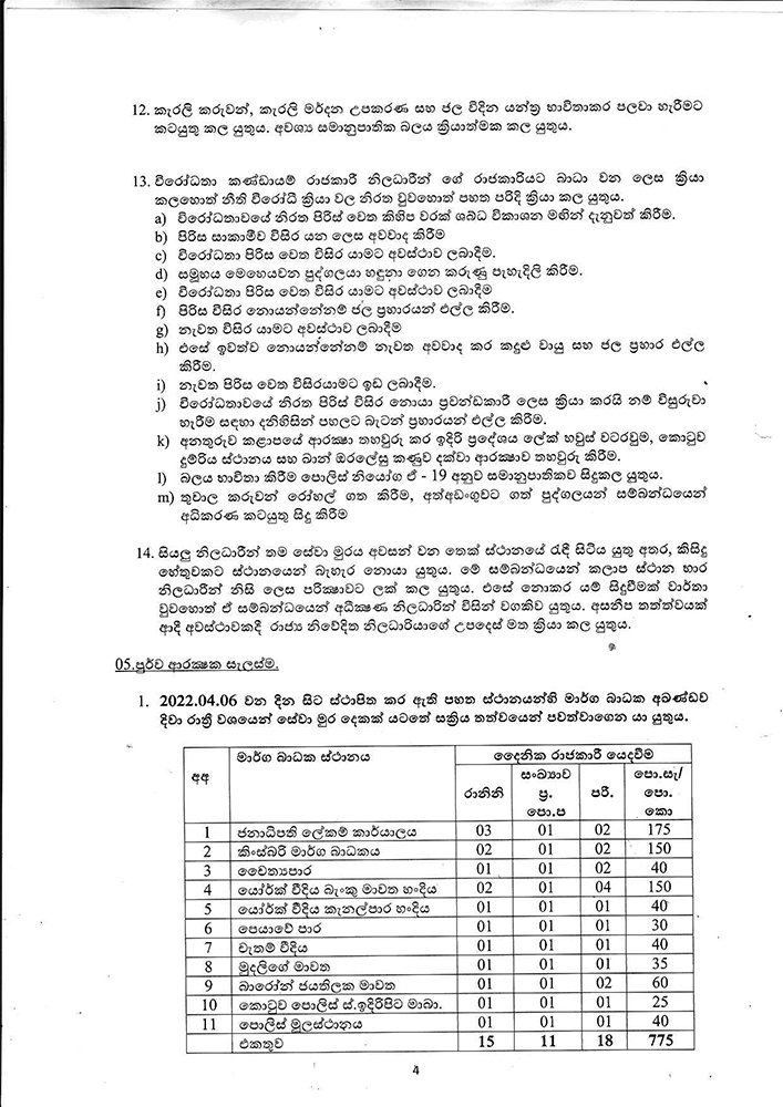 දැනට යොදා ඇති මාර්ග බාධකවලට අමතර ත්රිවිධ හමුදාව, විශේෂ කාර්ය බලකාය සහ අමතර පොලිස් නිලධාරී යොදවා පහත සඳහන් ස්ථානයන්හි මාර්ග බාධක යෙදවීමට ද උපදෙස් දී තිබේ.
