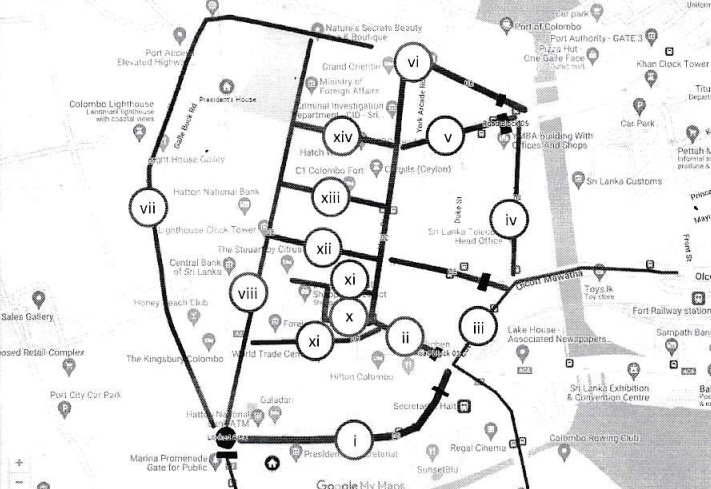 - ගපූර් ගොඩනැගිල්ල ආසන්නයේ සිට යෝර්ක් වීදිය දක්වා බාරෝන් ජයතිලක මාවත අසළ මාර්ග බාධකය