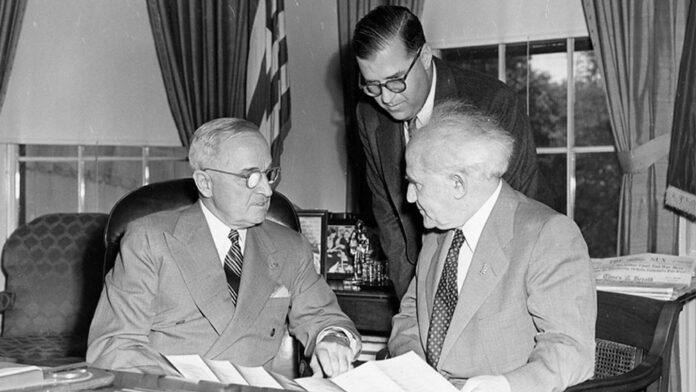 1948 මැයි 14 වන දින, ට්රෲමන් ඊශ්රායලයේ නව රාජ්යය පිළිගත්තේ, එහි නිදහස ප්රකාශ කිරීමෙන් මිනිත්තු කිහිපයකට පසුවය. සියොන්වාදී රාජ්යය පලස්තීනයෙන් තවත් 22%ක් ඈඳාගත් අතර පලස්තීනුවන් 750,000ක් වාර්ගික වශයෙන් තමන් සතු වූ භූමි ප්රදේශවලින් ඉවත් කළද, එක්සත් ජනපදය සහ එහි සහචරයෝ යුදෙව් වර්ණභේදවාදී රාජ්යයට දිගටම සහාය දුන්හ.