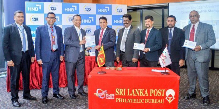 තැපැල්පති රුවන් සත්කුමාර 135 වැනි සාංවත්සරික සමරු මුද්දරය HNB කළමනාකාර අධ්යක්ෂ/ප්රධාන විධායක නිලධාරී ජොනතන් අලස් මහතා වෙත පිරිනමමින්. (වමේ සිට), HNB නියෝජ්ය සාමාන්යාධිකාරී පාරිභෝගික බැංකුකරණ සමූහය සන්ජේ විජේමාන්න, HNB නියෝජ්ය සාමාන්යාධිකාරී, ආයතනික බැංකුකරණ සමූහය (Wholesale Banking Group), දමිත් පල්ලෙවත්ත, නියෝජ්ය තැපැල්පති (මෙහෙයුම්), රාජිත කේ රණසිංහ, නියෝජ්ය තැපැල්පති (බස්නාහිර පළාත) සිසිර කුමාර වලල්ලාවිට, අධ්යක්ෂ – මුද්දර, තැපැල් දෙපාර්තමේන්තුව ලංකා ද සිල්වා සහ කොළඹ තැපැල් අධිකාරී චම්පික පෙරේරා යන මහත්වරුන් ද මෙම අවස්ථාවට සහභාගි විය.
