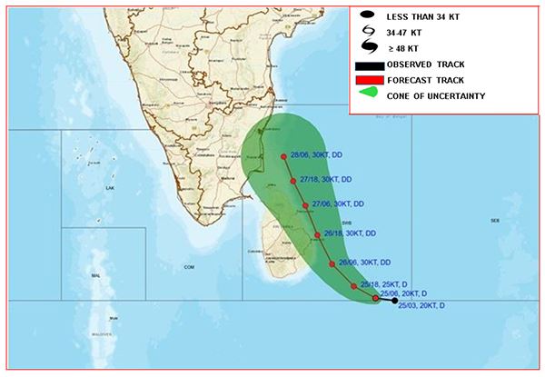 නිරිත දිග බෙංගාල බොක්ක ප්රදේශයේ පැවති ගැඹුරු පීඩන අවපාතය ඊයේ අලුයම 2.30 වන විට ත්රිකුණාමලයට ආසන්න වශයෙන් කිලෝමීටර් 100ක් පමණ ඊසාන දෙසින් ස්ථානගතව පැවතිණි. එය සෙමින් උතුරු-වයඹ දෙසට ගමන් කරමින් ශ්රී ලංකාවේ නැගෙනහිර වෙරළට ආසන්න වෙමින් සුළි කුණාටුවක් දක්වා තීව්ර විය හැකි බවට අපේක්ෂා කෙරේ.