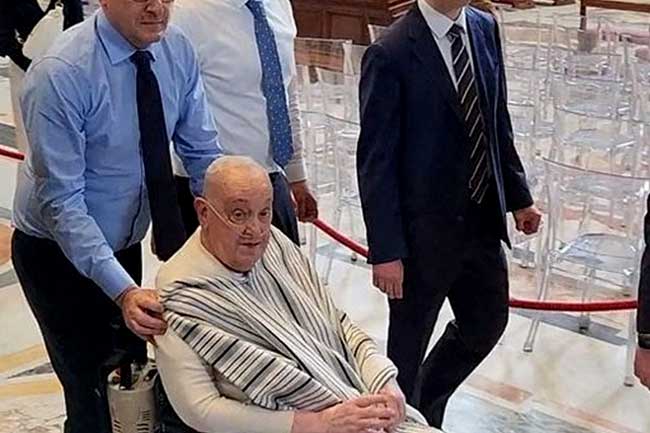 නිව්මෝනියාවට ගොදුරු වී රෝගාතුරව සිටි ෆ්රැන්සිස් පාප්වහන්සේ, සිය සම්ප්රදායික ඇඳුමින් බැහැරව සාමාන්ය ඇඳුමකින් සැරසී ශාන්ත පීතර බැසිලිකාවට පැමිණ ඇත.