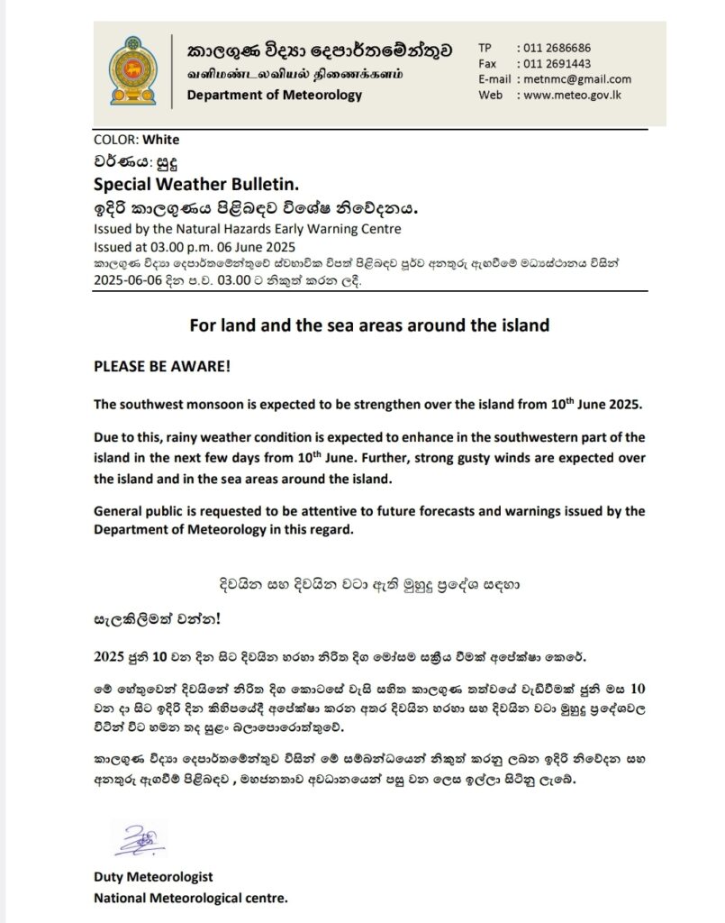 කාළගුණ විද්යා දෙපාර්තමේන්තුව විශේෂ නිවේදනයක් නිකුත් කරමින් පවසන්නේ, ජුනි 10 වන දින සිට දිවයින හරහා නිරිතදිග මෝසම ශක්තිමත් වීම හේතුවෙන් දිවයිනේ නිරිතදිග කොටසේ වැසි සහිත කාලගුණික තත්ත්වය වැඩි වනු ඇතැයි අපේක්ෂා කරන බවයි.