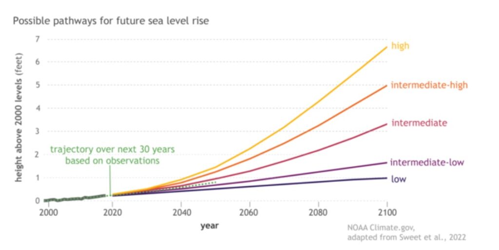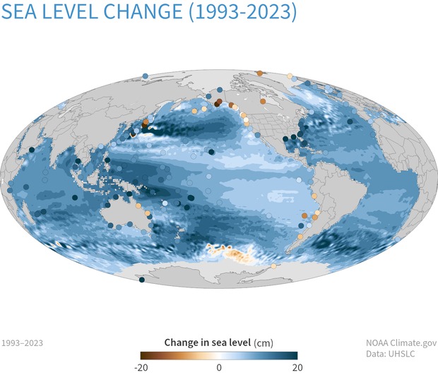 1993 සිට 2023 දක්වා කාලය තුල මුහුදු මට්ටම ගෝලීය වශයෙන් ඉහළ ගොස් ඇති බවත්, එය ඇතැම් සාගර ද්රෝණියන්හි අගල් 6-8 අගයක් ගන්නා බවත් හවායි විශ්ව විද්යාලයේ පිලිප් තොම්සන්ගේ දත්ත NOAA Climate.gov වෙබ් අඩවිය සදහන් කරඇත.