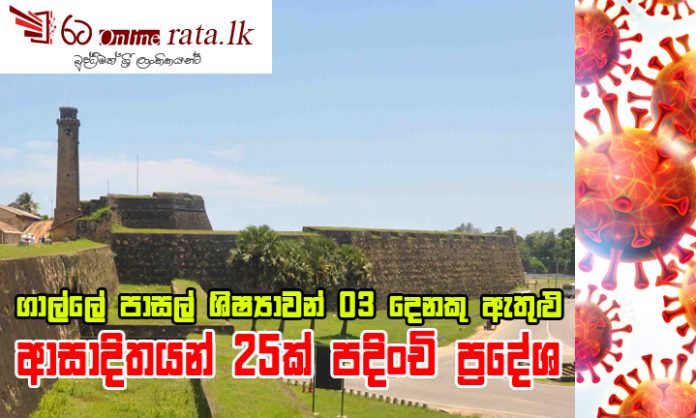 ගාල්ල සෞඛ්ය වෛද්ය නිලධාරී කොට්ඨාසයේ පසුගිය 09 වැනි දා කරන ලද පීසීආර් පරීක්ෂණ 1729ක් අතරින් මේ වනවිට ආසාදිතයන් 25 දෙනකු හමුවී ඇතැයි සෞඛ්ය අංශ නිල වශයෙන් ප්රකාශයට පත්කර තිබේ.